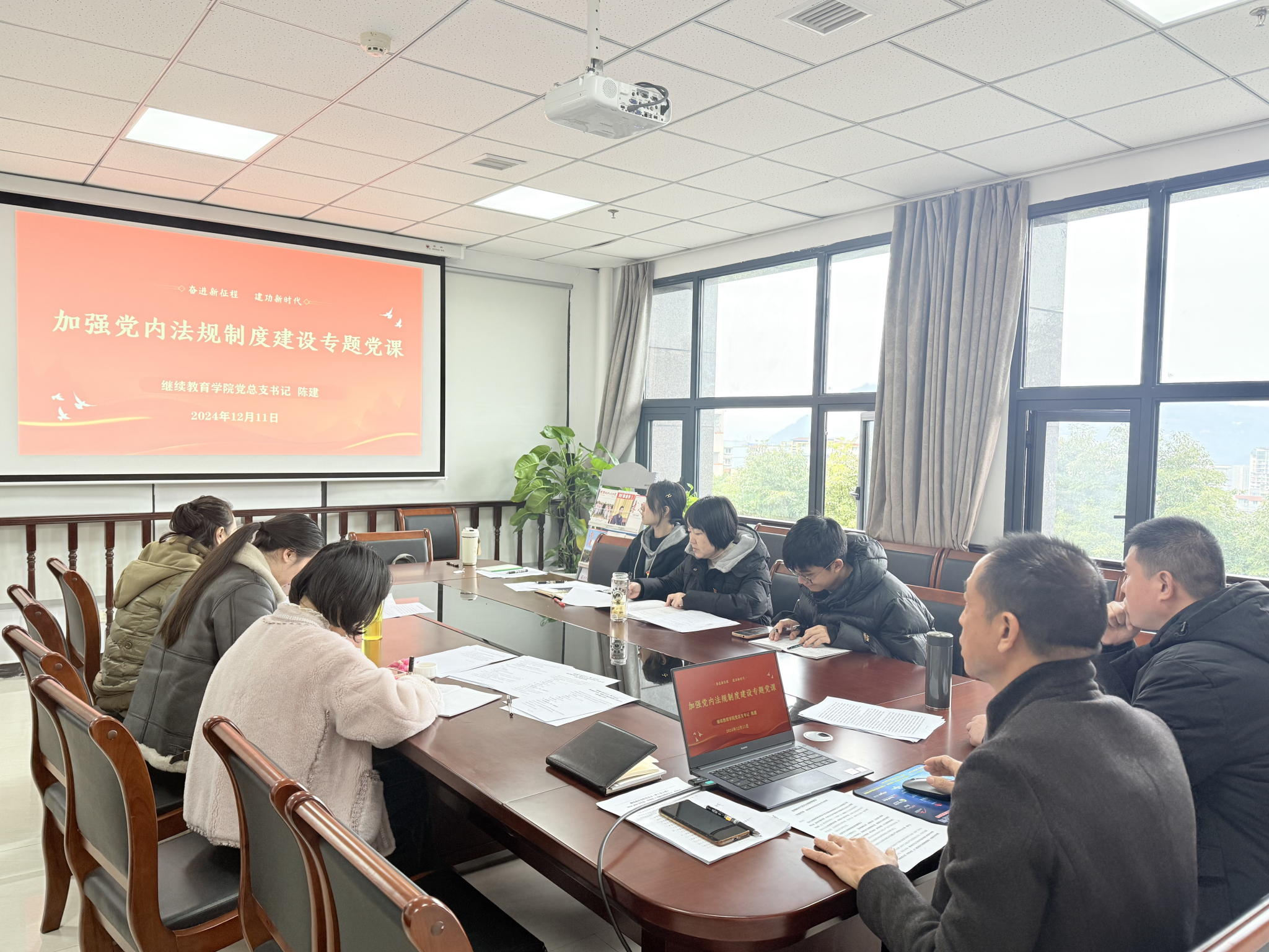 为凝聚党内法规学习宣传合力,进一步强化党员干部法规意识、提高法规素养,营造遵规学规守规用规的浓厚氛围,推动党内法规制度优势转化为更大治理效能,继教学院党总支按照12月组织生活计划安排,于2024年12月11日上午在科技楼202开展了“普法宣传进校园,法规意识入人心”的专题组织生活会。