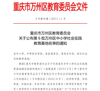 11月27日,重庆市万州区教育委员会下发了《重庆市万州区教育委员会关于公布第6批万州区中小学社会实践教育基地名单的通知》,我校继续教育学院申报的“太阳成tyc7111cc中小学素养教育社会实践基地”被评定为万州区中小学社会实践教育基地,体现了我校切实落实立德树人根本任务,发挥服务社会职能取得了新突破。