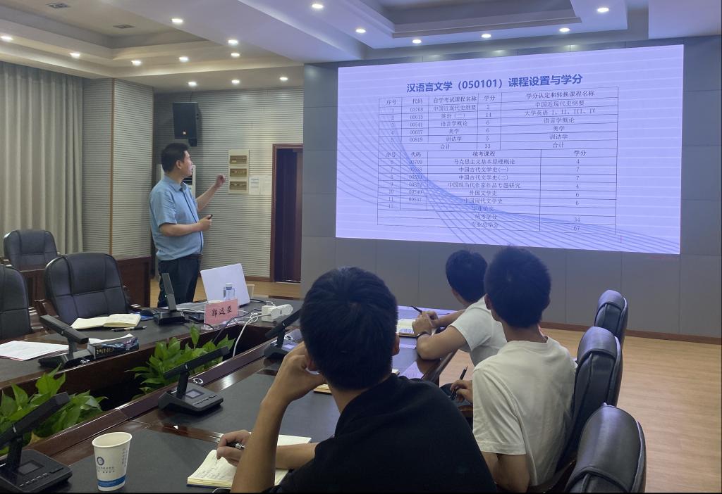 会议伊始,郭远臣以身边真实成功事例为开场,讲述了提升学历的重要性,他讲解了国家关于高等教育自学考试的相关政策、学习方式以及社会认可度,并指出自学考试相较于其他学历提升途径,具有成本低、时间短、含金量高等优势。此外,他还深入分析了在校生参加自学考试的优势,并就与学生息息相关的专业选择、课程设置、学位申请等问题进行了详细解读。